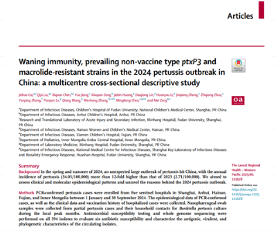 2024年春夏之交,一场罕见的百日咳大暴发席卷全国。国家监测数据显示:全年发病率34.03/10万,较 2023年飙升12倍以上,报告病例数创1982年以来历史新高。百日咳为何“死灰复燃”,复旦大学附属儿科医院曾玫教授团队联合全国5家哨点医院,完成迄今国内最大规模百日咳多中心研究,成果发表于《柳叶刀-区域健康(西太平洋)》,首次完整揭开本轮暴发的核心原因。