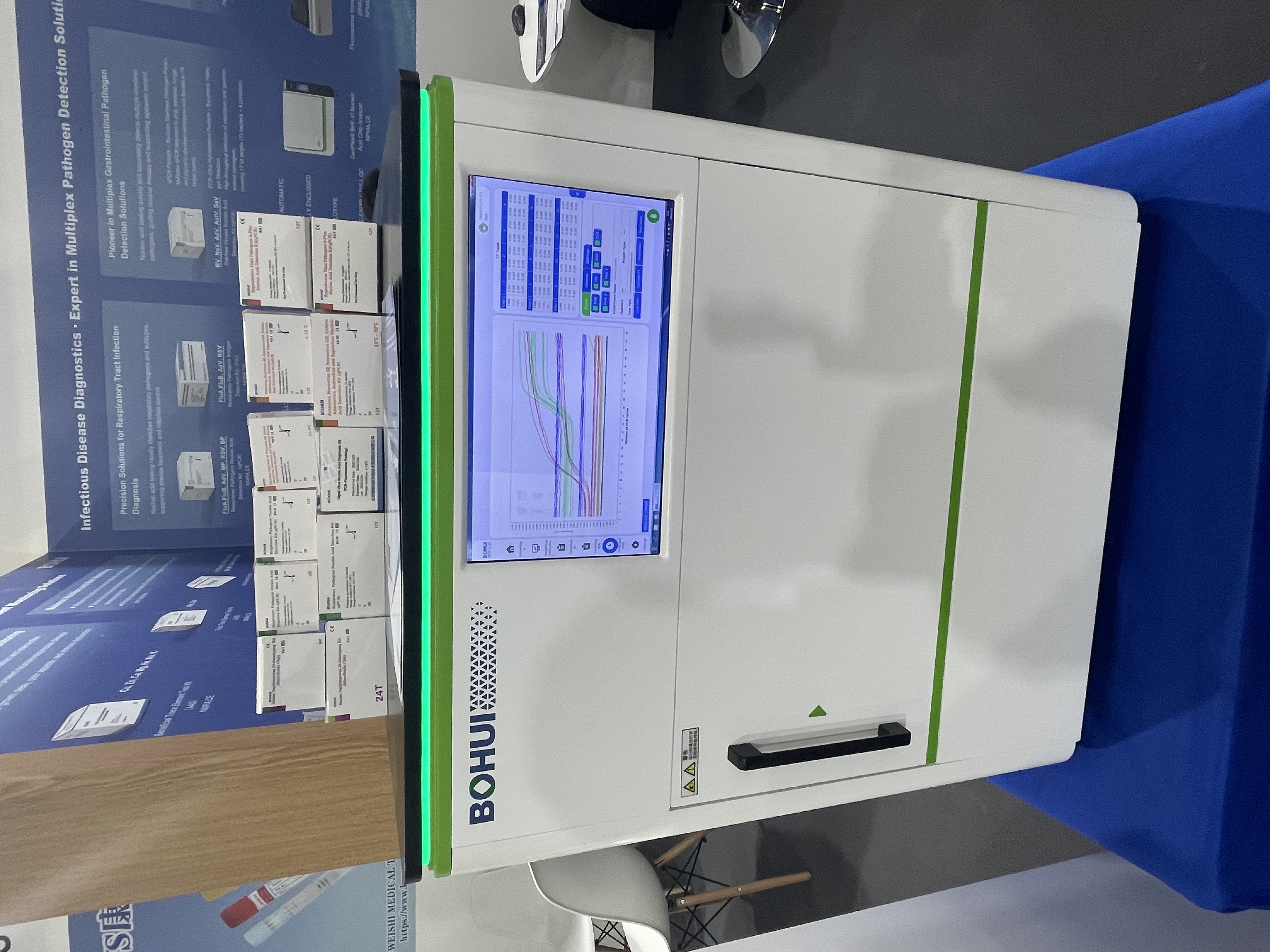 本次展出的设备,BHQ-Ⅲ全自动多病原核酸检测系统将qPCR方法学与PCR芯片杂交方法学深度融合,实现真正意义上的“双功能及系统融合”。